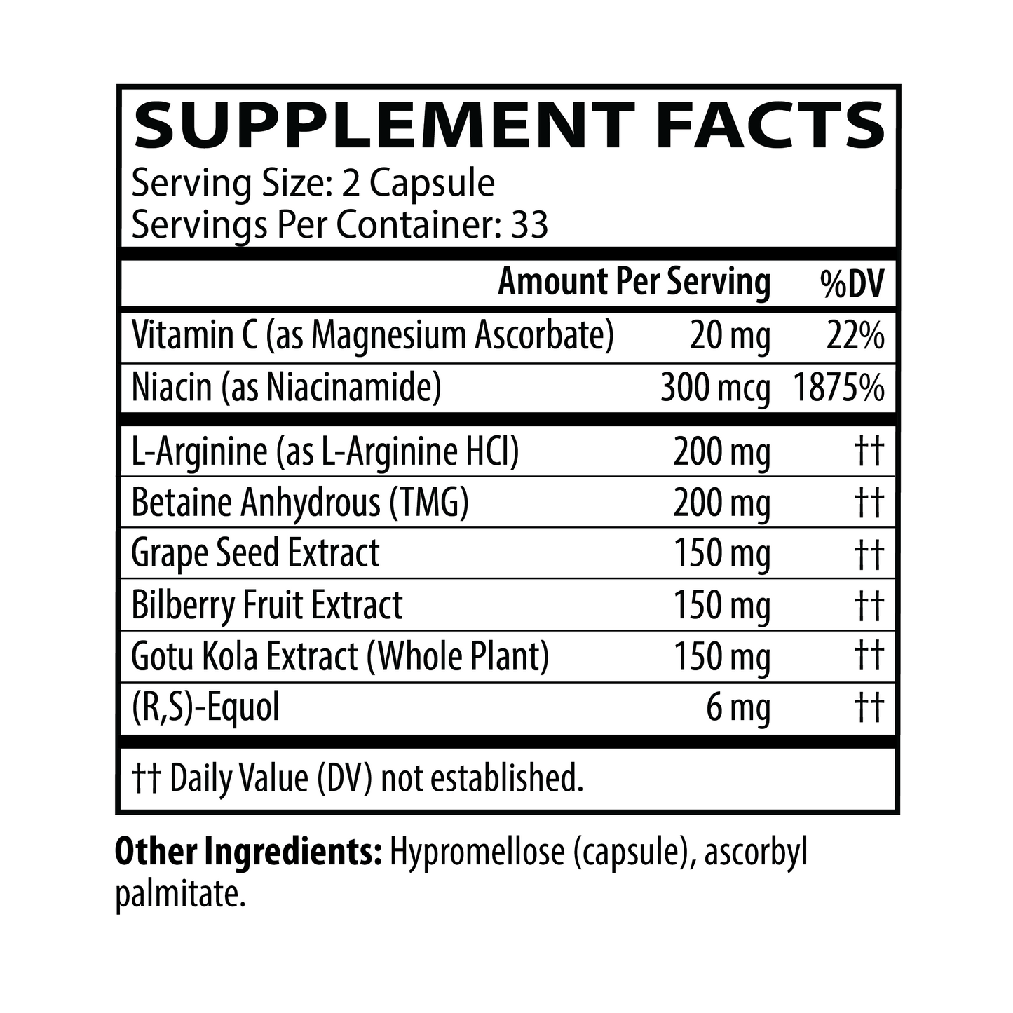 To further enhance vessel tone and microcirculation, anthocyanin-rich grape seed and bilberry extracts support antioxidant defense, while Gotu Kola promotes capillary strength and healthy venous function.*