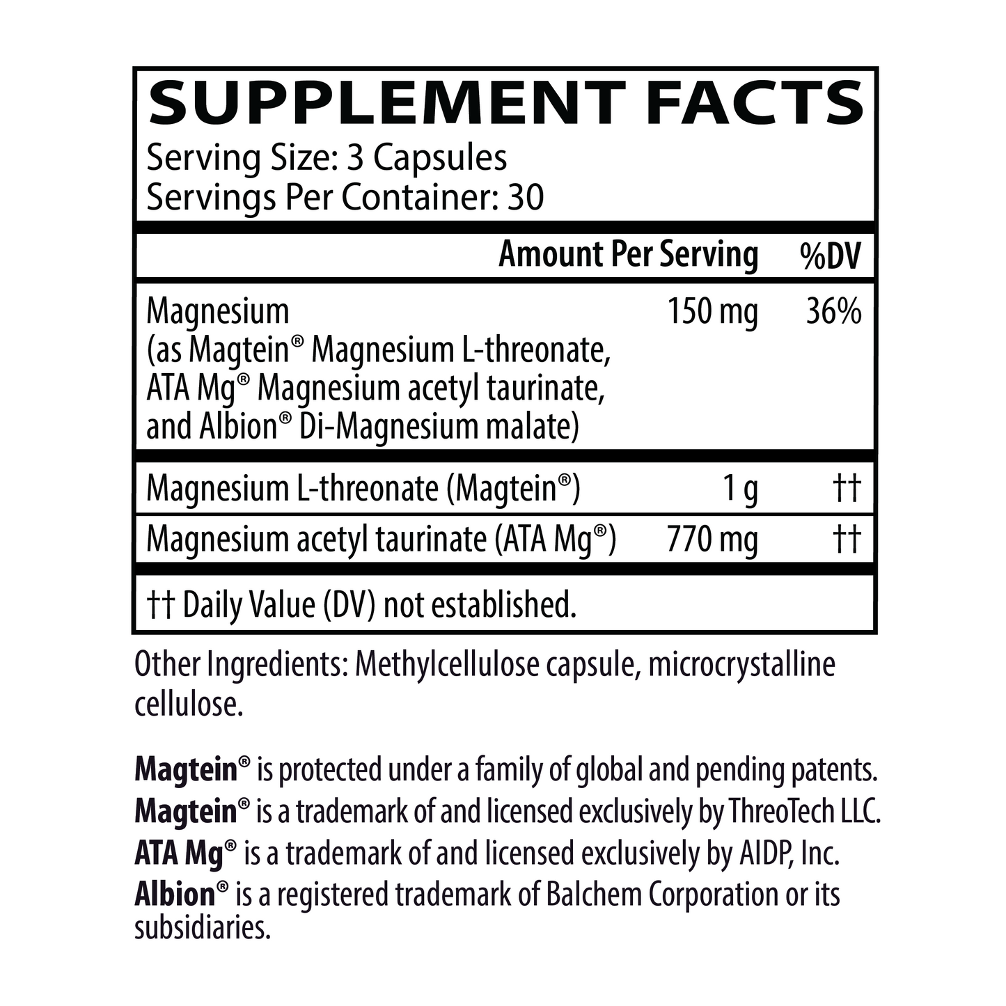 MindMag Ultra is a premium triple-action magnesium formula designed to power both your brain and body. Featuring two clinically studied forms of magnesium - Magtein® (magnesium L-threonate) and ATA Mg® (magnesium acetyl taurinate) - both shown to effectively cross the blood-brain barrier and increase magnesium levels in the brain.