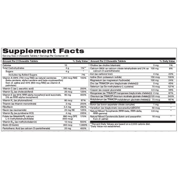 Natural-source carotenes provide better antioxidant action than synthetic beta-carotene. Metafolin® as L-5-methyltetrahydrofolate (L-5-MTHF), an active form of folate (Vitamin B9), is included to ensure more immediate effects on metabolism than traditional folic acid essential to healthy child development. Mineral compounds, including amino acid chelates and citrates, are selected for easy and comfortable digestion for even the most sensitive individuals. This chewable multivitamin is perfect for picky palates and those who have trouble swallowing pills.*